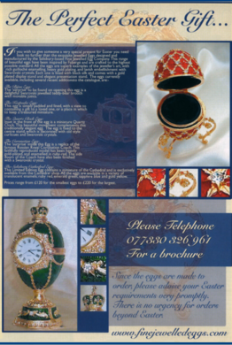 Eggs were made to order and took approximately 8 - 12 weeks to complete and on occasions longer. They were made by us here in Great Britain and were all finished with genuine Chaton
